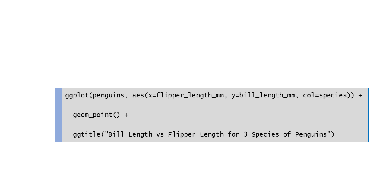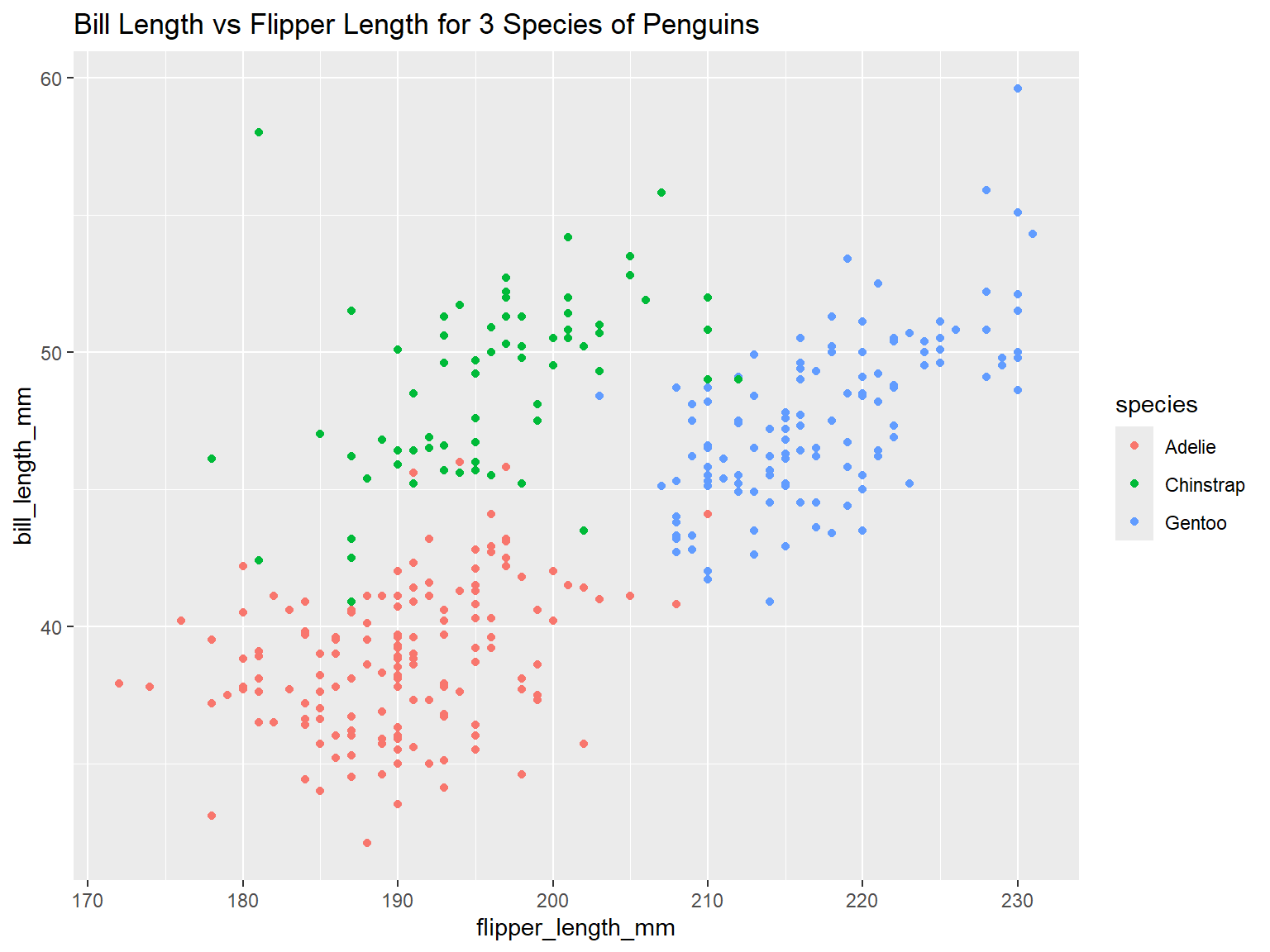 ggplot(penguins, aes(x = flipper_length_mm, y = bill_length_mm, color = species)) +