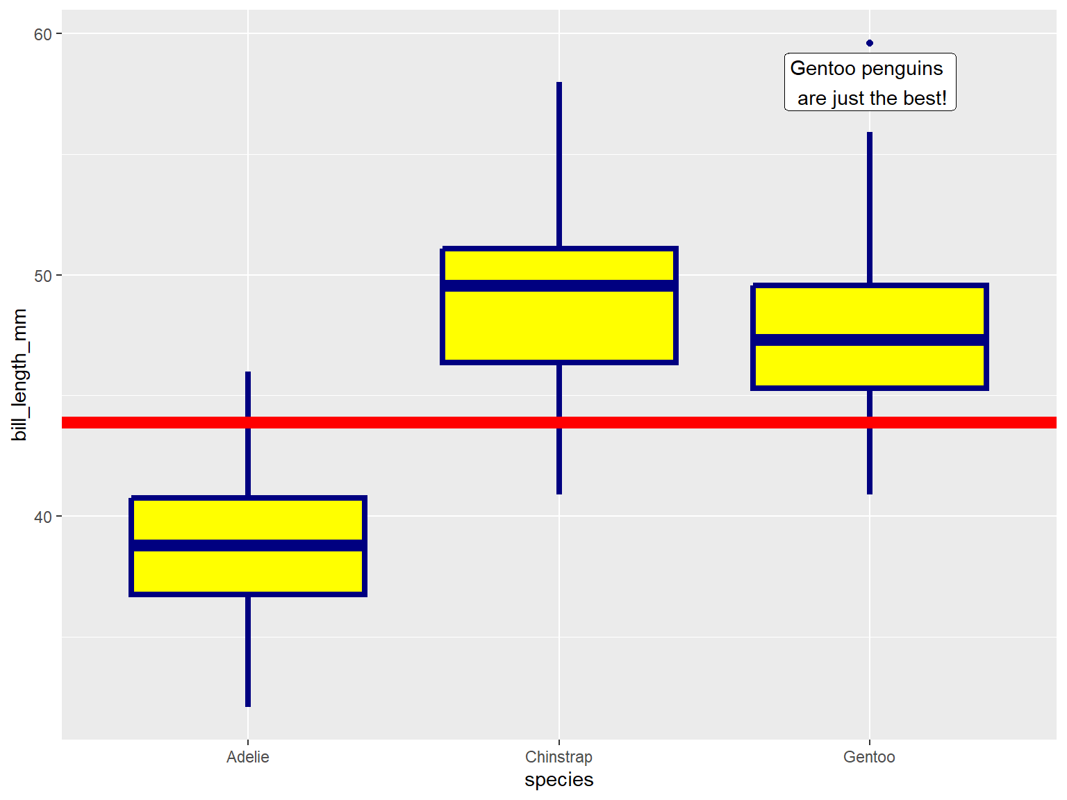 geom_label(x = 3, y = 58, label = "Gentoo penguins \n are just the best!")## Warning: Removed 2 rows containing non-finite outside the scale range