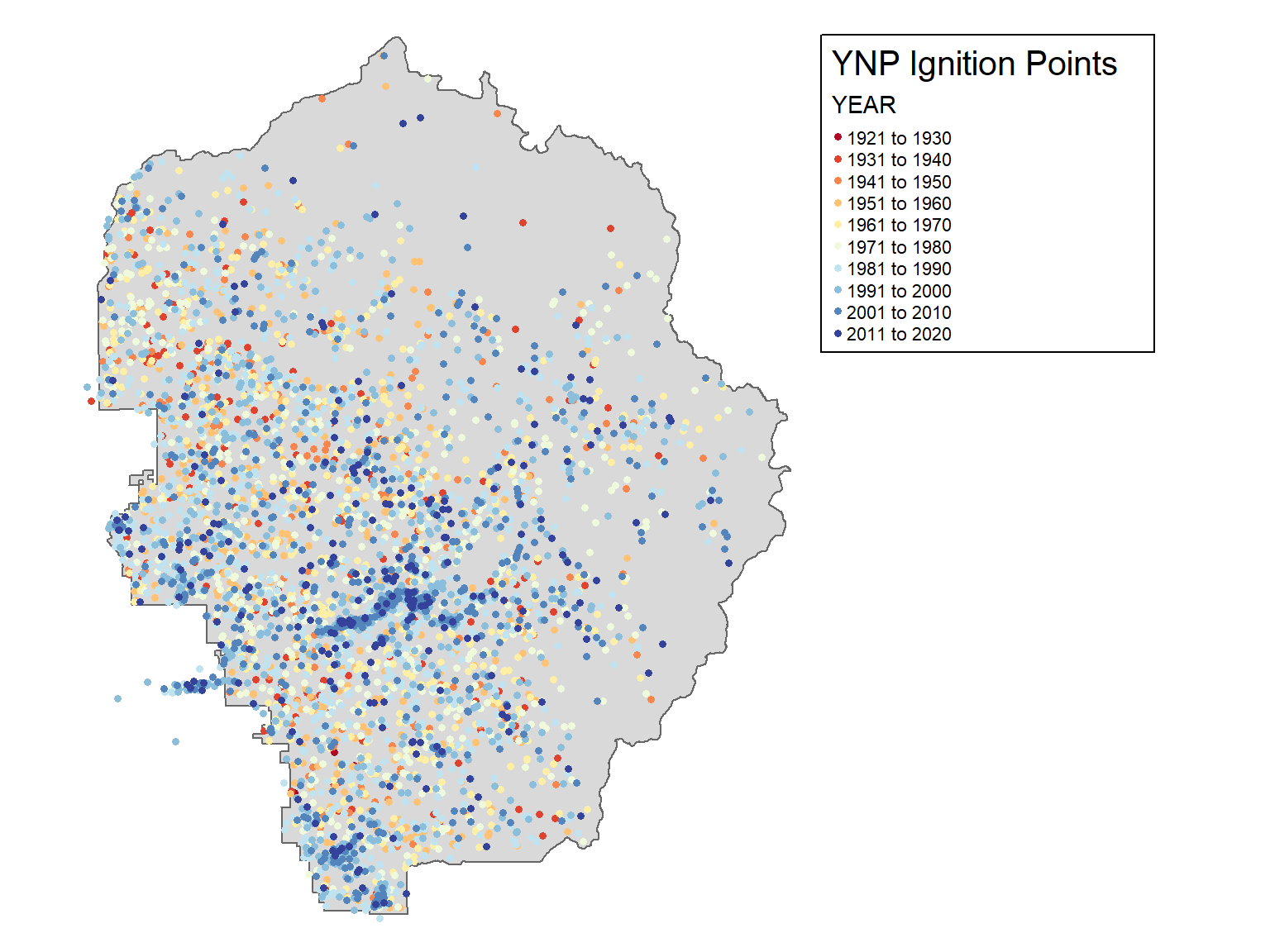 The Yosemite Fire History geodatabase contains a point layer of fire ignition points, and a polygon layer of fire burned areas in YNP, 1930-2016.